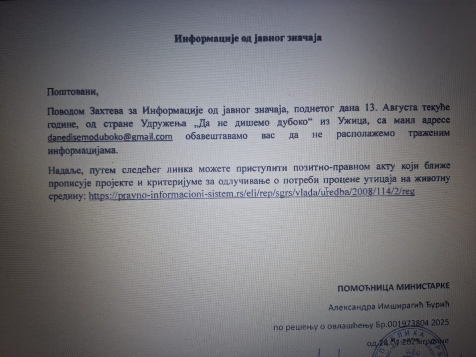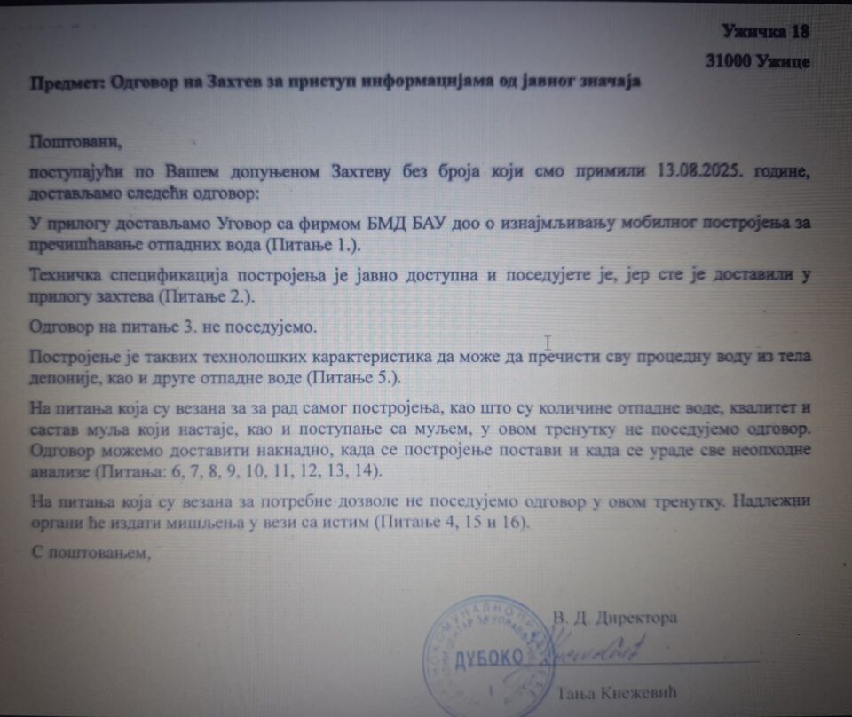 Isti zahtev udruženje je prosledilo i Ministarstvu zaštite životne sredine i Gradu Užicu i dobilo odgovor da ove institucije nemaju potrebne informacije i da nisu učestvovale u nabavci, izgradnji i puštanju u rad predmetnog postrojenja.