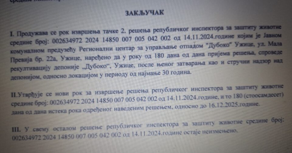 Podsećamo, Osnovni sud u Užicu je Rešenjem od 13. novembra 2024. godine odredio privremenu meru obezbeđenja nenovčanog potraživanja tužilaca i zabranio prvooptuženom JKP RCUO Duboko da neovlašćeno skladišti, vrši tretman neopasnog otpada i isti odlaže na deponiju, kao i da privremena mera važi do pravosnažnog okončanja postupka.