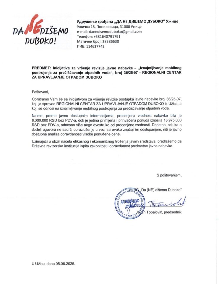 Udruženje građana „Da (Ne) Dišemo Duboko“ uputilo je predstavku Upravi za javne nabavke u vezi sa postupkom javne nabavke „Iznajmljivanje mobilnog postrojenja za prečišćavanje otpadnih voda“ koju je sproveo RCUO „Duboko“ kao i inicijativu Državnoj revizorskoj instituciji za vršenje revizije javne nabavke.
