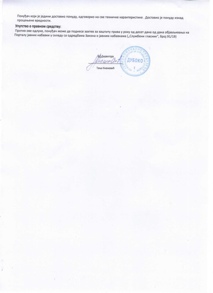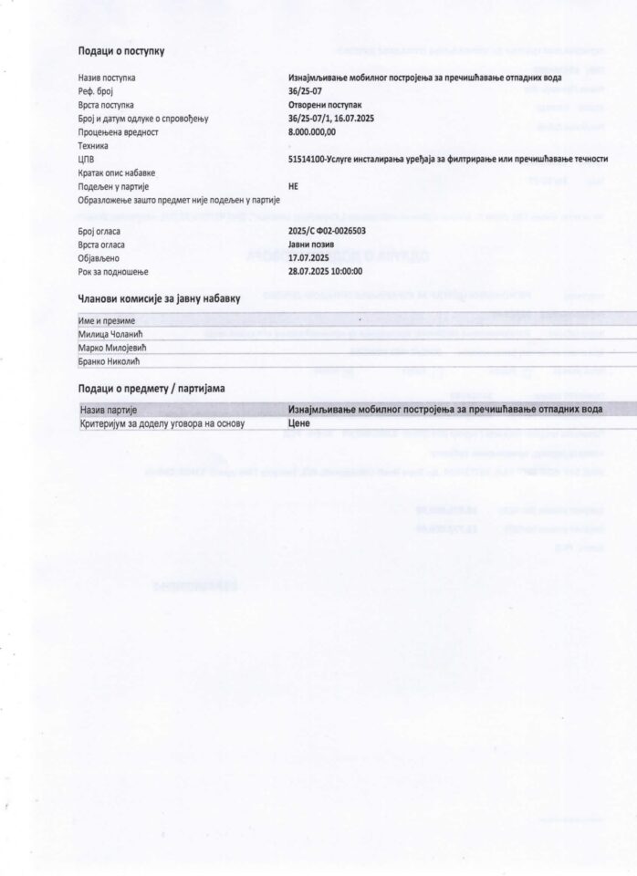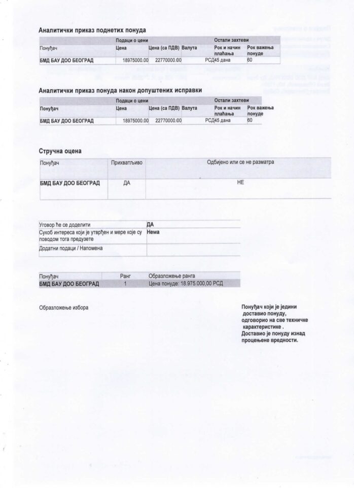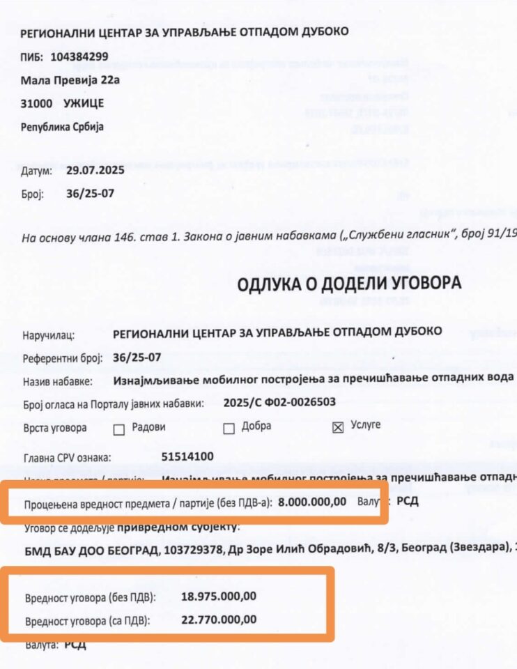 „Prema javno dostupnim podacima, procenjena vrednost nabavke iznosila je 8.000.000 dinara, dok je jedina podneta ponuda iznosila 18.975.000, što je više nego dvostruki iznos od procenjene vrednosti. Iako je u postupku učestvovao samo jedan ponuđač, izabrana je ponuda sa značajnim odstupanjem u ceni, bez javno dostupnog obrazloženja takve odluke. Time je moguće da je došlo do povrede člana 3, 100 i 106 Zakona o javnim nabavkama, odnosno moguće je da je ugovor dodeljen iako ponuda nije bila prihvatljiva u skladu sa zakonom“, navodi se u predstavci.