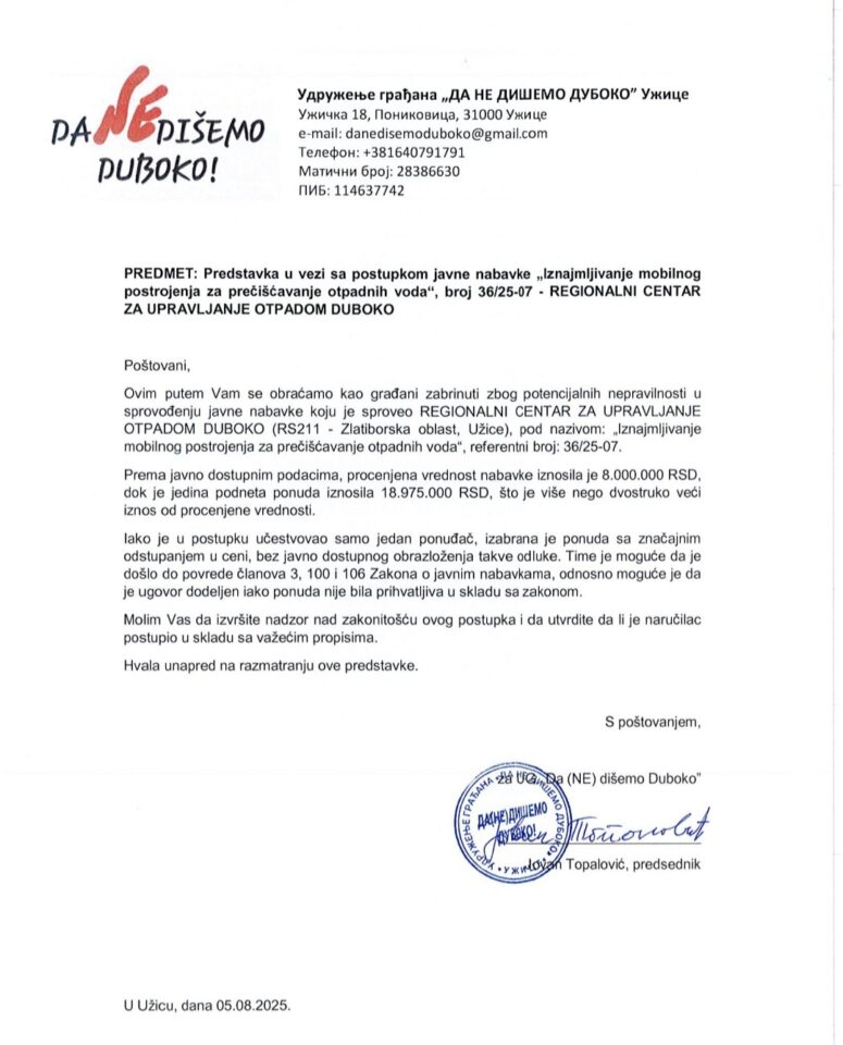 U predstavci Upravi za javne nabavke se navodi zabrinutost udruženja zbog potencijalnih nepravilnosti nabavke i traži se nadzor nad zakonitošću postupka kao i utvrđivanje da li je naručilac postupio u skladu sa propisima.