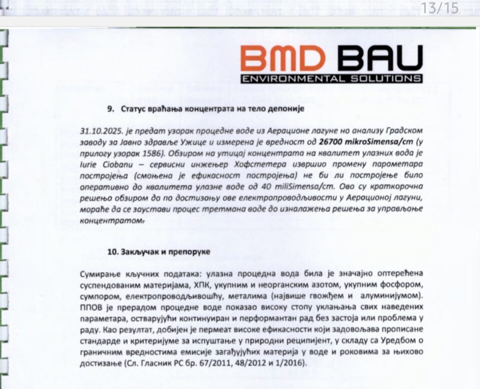 Postrojenje od prerađenih procednih voda proizvodi 57,6 odsto filtrirane vode i 42,4 koncentrata koji se vraća u lagunu. Prečišena voda zadovoljava parametre za isput u Turski potok, međutim kvalitet ulazne vode stalno se pogoršava zbog čega je smanjena efikasnost postrojenja. U izveštaju upozoravaju da će zaustavljanje postrojenja uskoro biti neizbežno te da je neophodno što pre obezbediti uslove da se koncentrat ne vraća u lagunu.