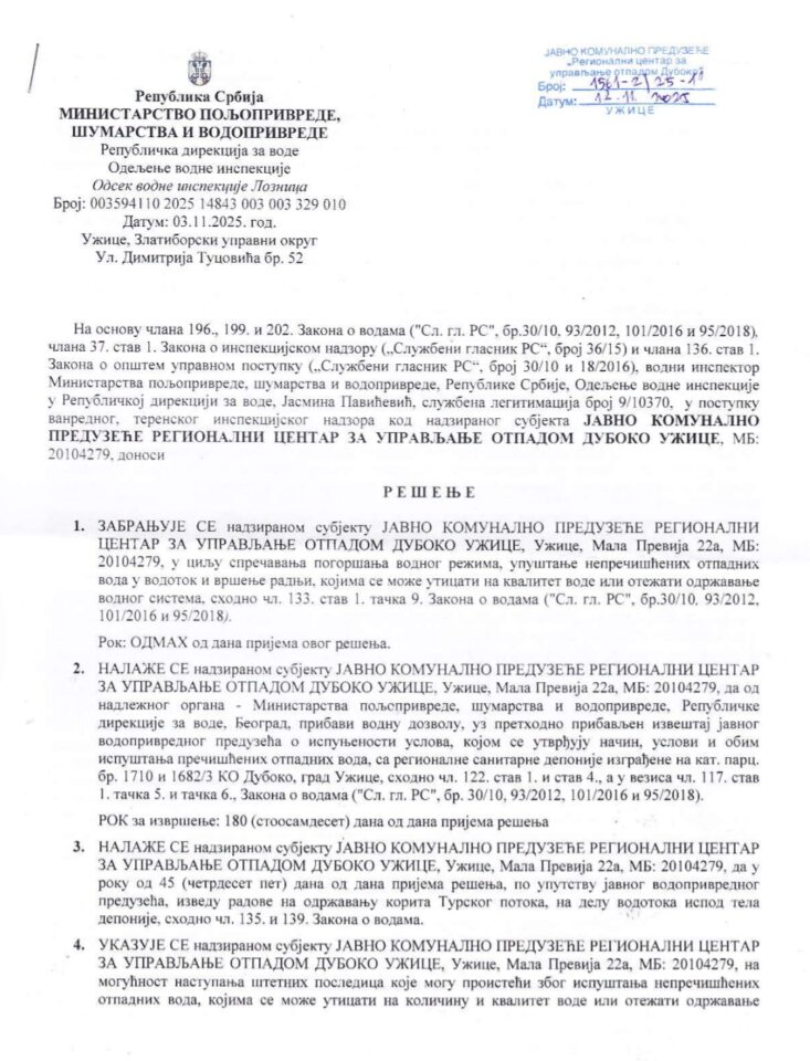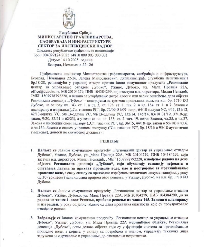 Inspektor MGSI je, tokom vanrednog nadzora, konstatovao da su zbog požara 2024. godine devastirane lagune za prihvat procedne vode i da postoji opasnosti od prodora ove vode u Turski potok čime su ugtoženi život i zdravlje ljudi! MGSI je doneo rešenje 14.10.2025. kojim je naložilo JKP RCUO Duboko izvođenje radova na sanaciji defekata i oštećenja laguna kao i postrojenje za prečišćavanje otpadne vode u roku od 30 dana, kao i da za ove radove pribavi rešenje iz člana 145. Zakona o planiranju i izgradnji. MGSI je zabranilo korišćenje objekata RCUO, osim delova koji su u funkciji sistema za prečišćavanje procednih voda.