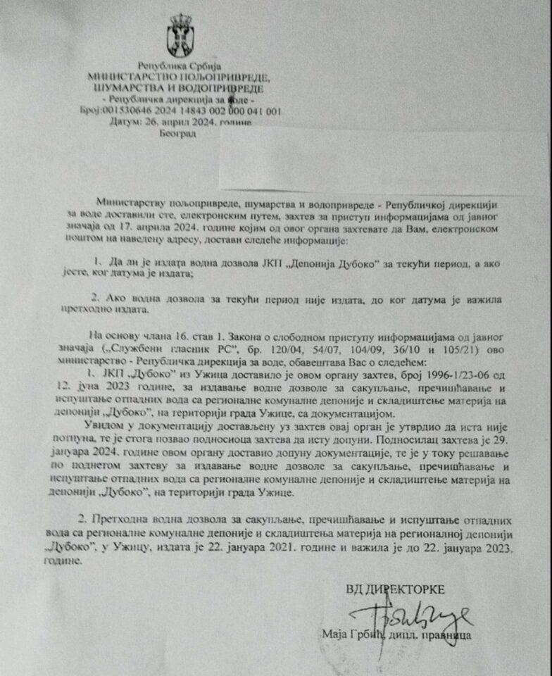Podsećamo, Ministarstvo žaštite životne sredine je rešenjem od 29. februara 2021. godine zabranilo JKP RCUO “Duboko” ispuštanje površinske vode u recipijent Turski potok i da je zabrana trajna, kao i da ovo preduzeće nema važeću vodnu dozvolu, jer je istekla 22. januara 2023. godine.
