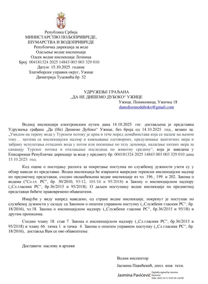 Udruženje građana „Da (Ne) Dišemo Duboko“ je nakon jučerašnjeg obilaska Turskog potoka i uvida u katastrofalno stanje uputilo prijavu Odeljenju vodne inspekcije Direkcije za vode koja je potvrdila da će biti izvršen vanredan inspekcijski nadzor.